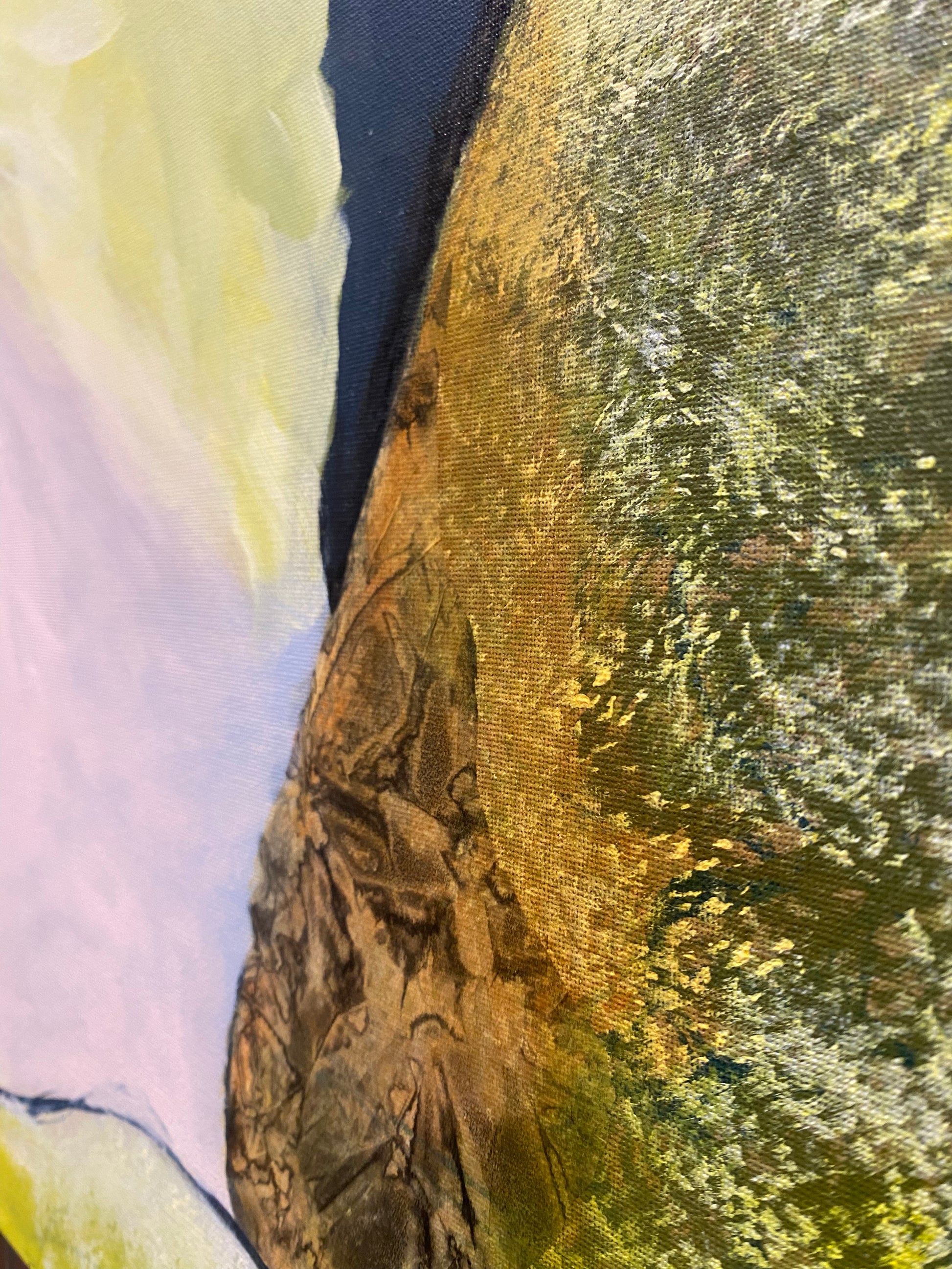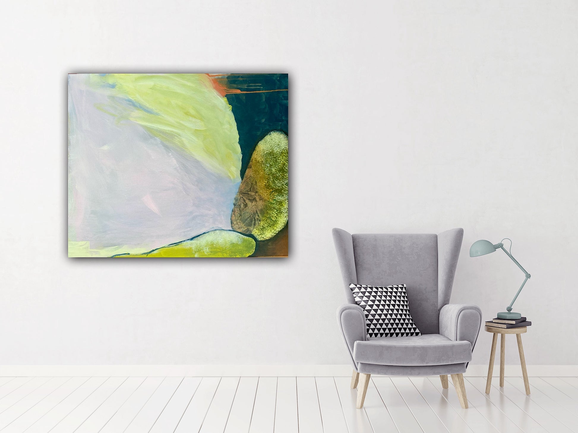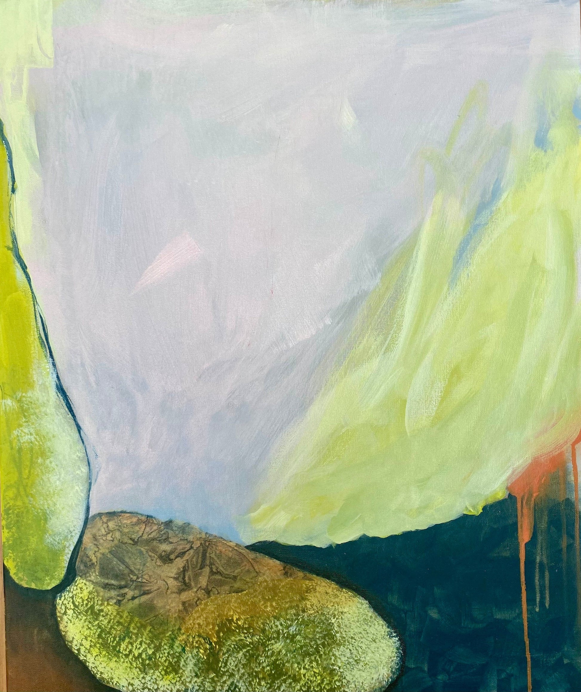 This painting by Janice Eliovson is an abstract reflection of a moment spent in quiet contemplation by the sea—where textured, moss-covered boulders meet the stillness of the ocean. Using a limited palette of vibrant and pastel hues, and anchored by the depth of dark values, Eliovson explores the subtle tensions and harmonies between solidity and fluidity, stillness and motion. Large oval forms evoke boulders softened by sea moss and time, standing as silent witnesses in the landscape. Viewers are invited into a meditative space, where observation gives way to reverie and a sense of inner peace emerges from the vastness and quiet of the natural world.