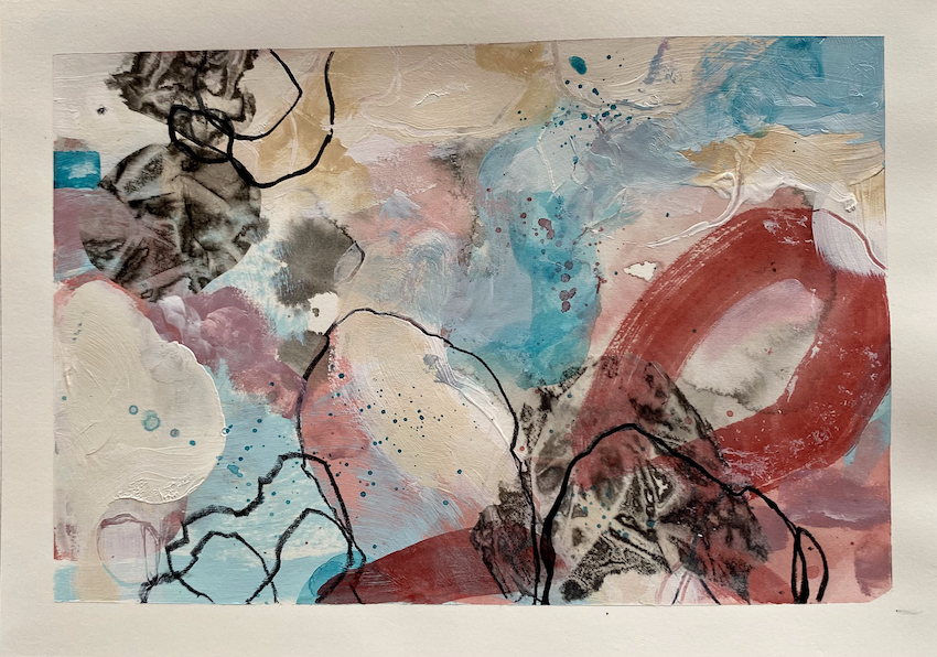 Bold, fiery red brushstrokes engage the viewers eye in this dynamic and uplifting exploration of contrasts.