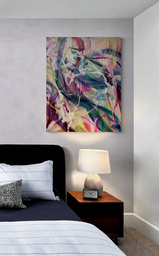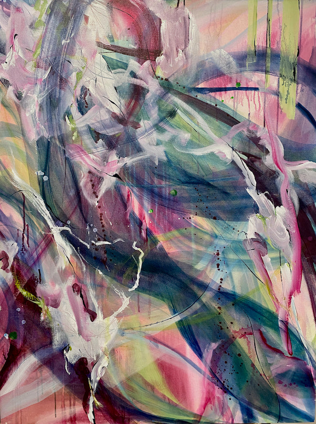 As like many of my artworks, this piece began far-removed from the concept it evolved into - the heady joy of wash day. My attraction to magenta and it’s vibrant, warming joy sparked the foundation of this abstract piece. Using a limited palette, I explored the effect of organic shapes veiled with transparent colour on a backdrop of uplifting vibrancy.