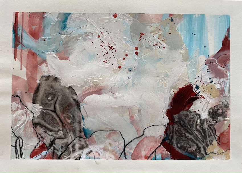 The artists use of handmade collage bring a textural element to this ambient artwork. The open expanse creates a feeling of tranquillity and a sense of connection to the ocean and sky.