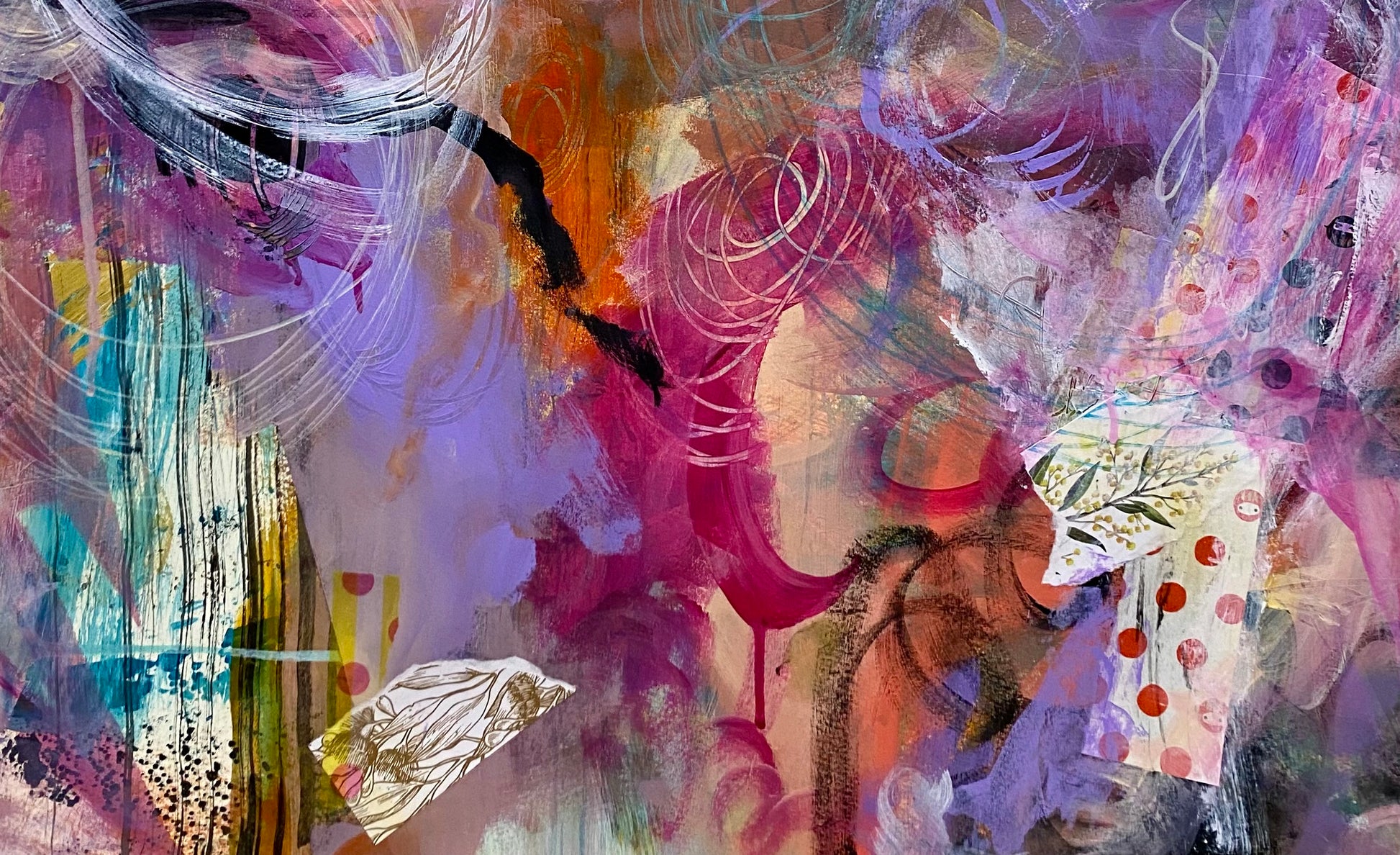 A fun abstracted mixed media exploration of joyous vibrant colours, movement and beauty. Paired with another artwork in this series to complete the story of circus festivities.