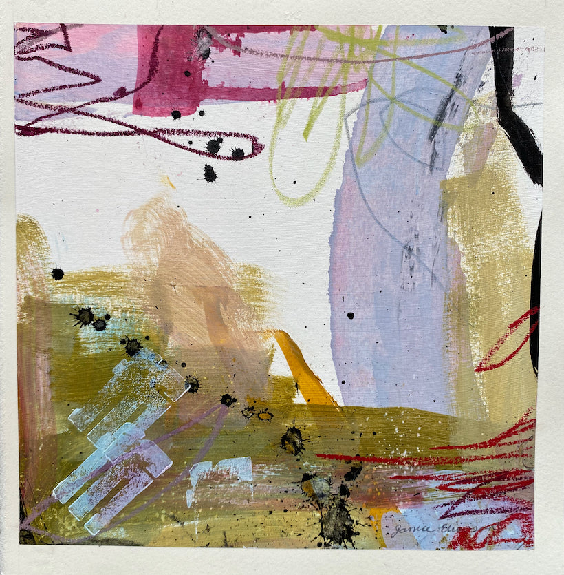 Splatters of black interrupt the notable brushstrokes bringing movement to this composition.