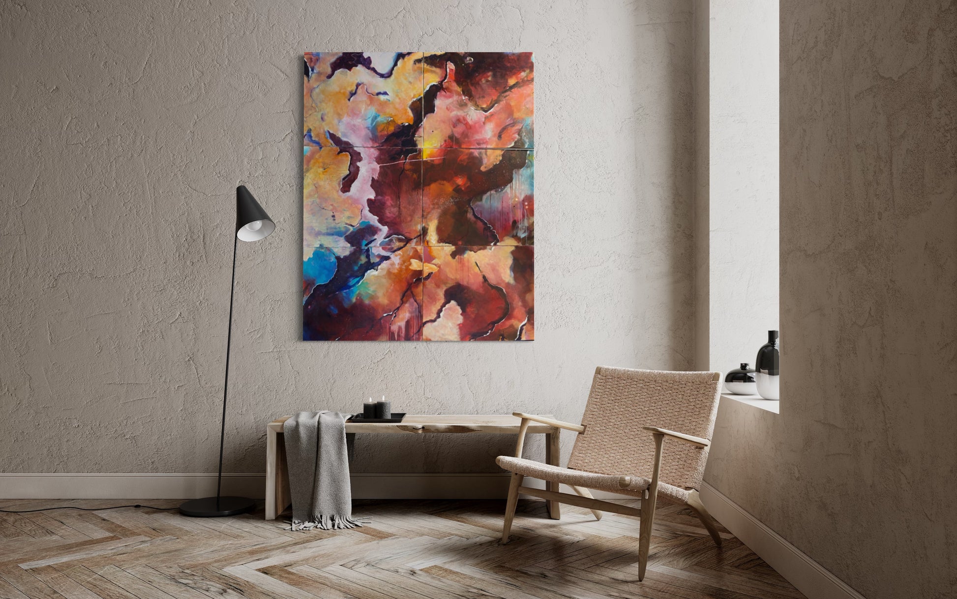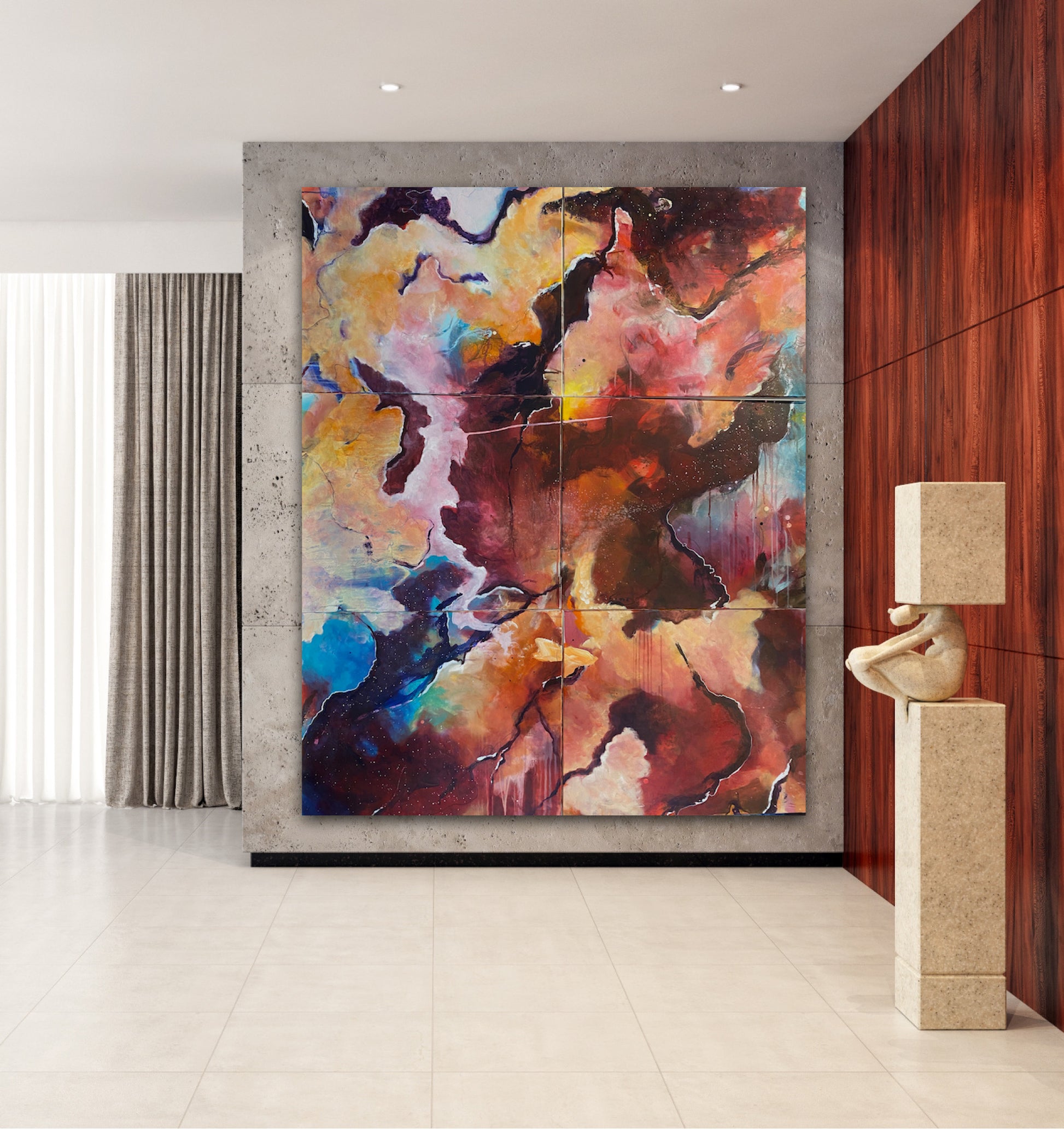 'Cosmic Scape' is a 6 piece artwork which can be hung in multiple orientations. Each individually stretched canvas can either be hang touching one another or separated to allow breathing space for this artwork.