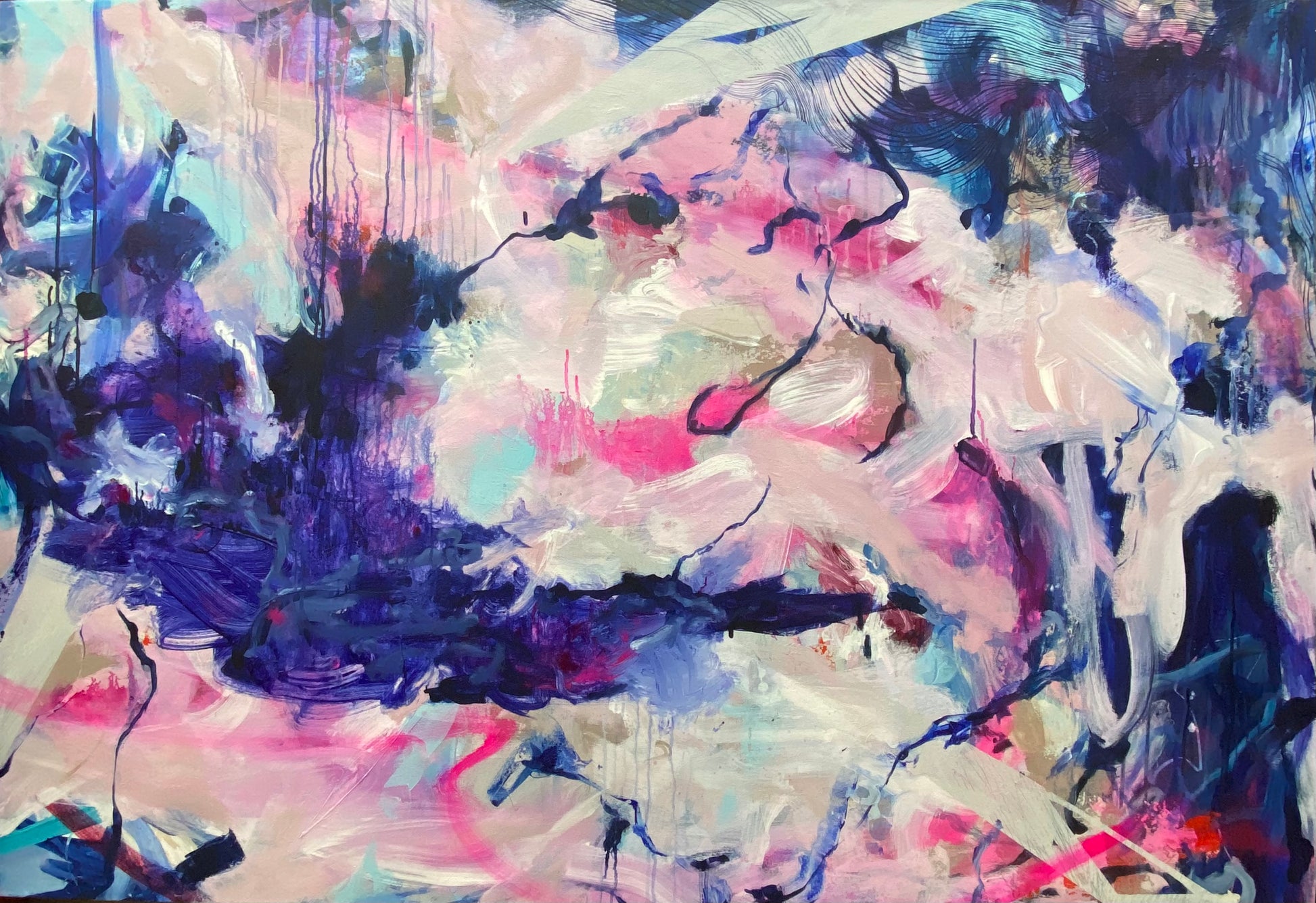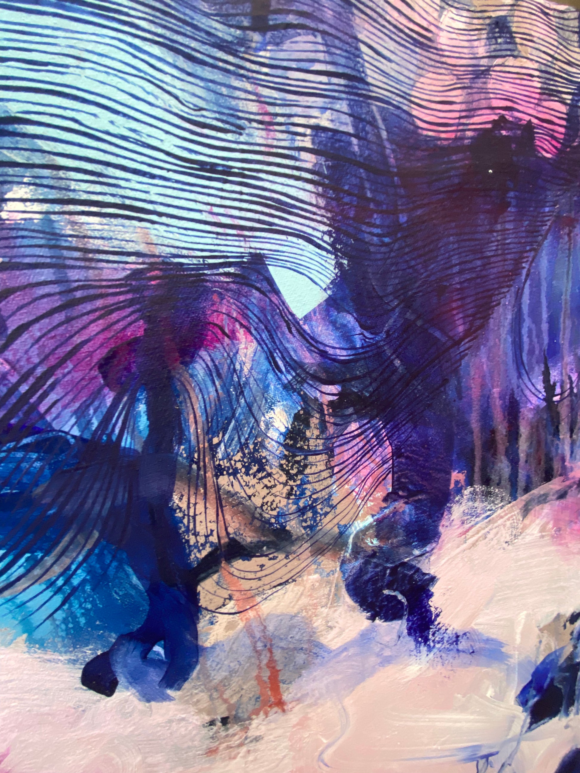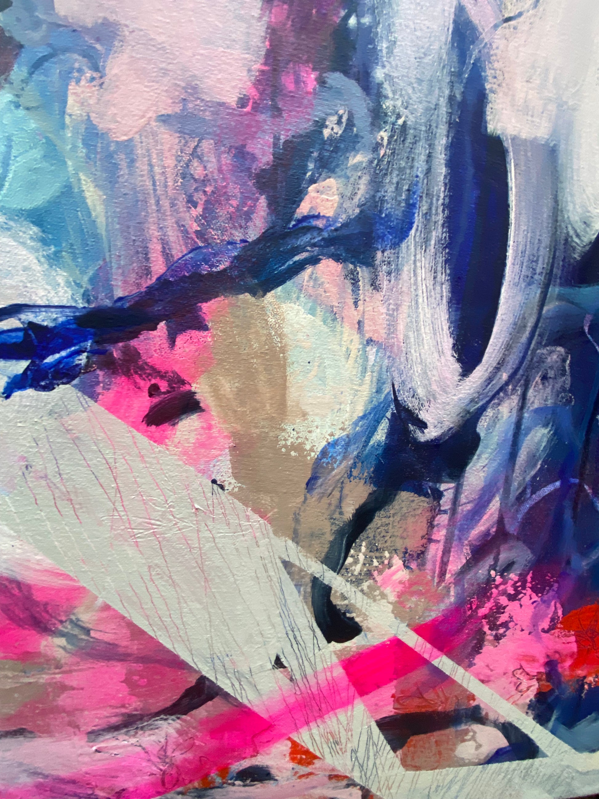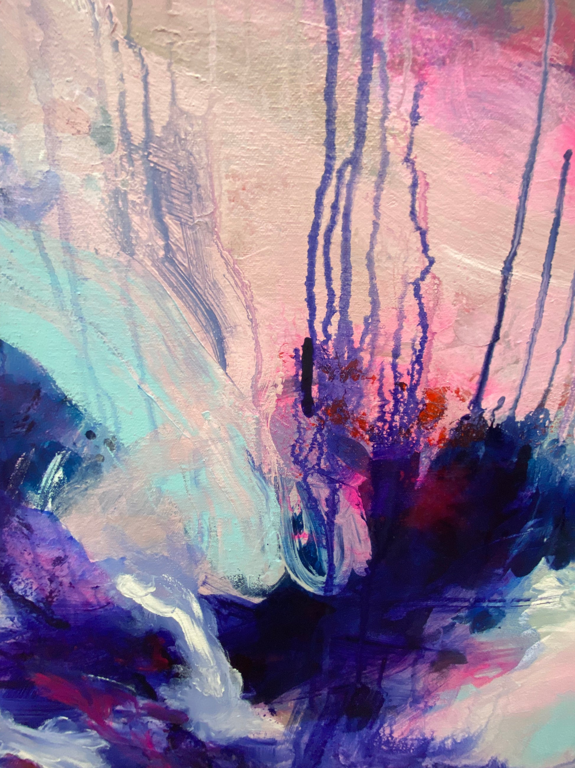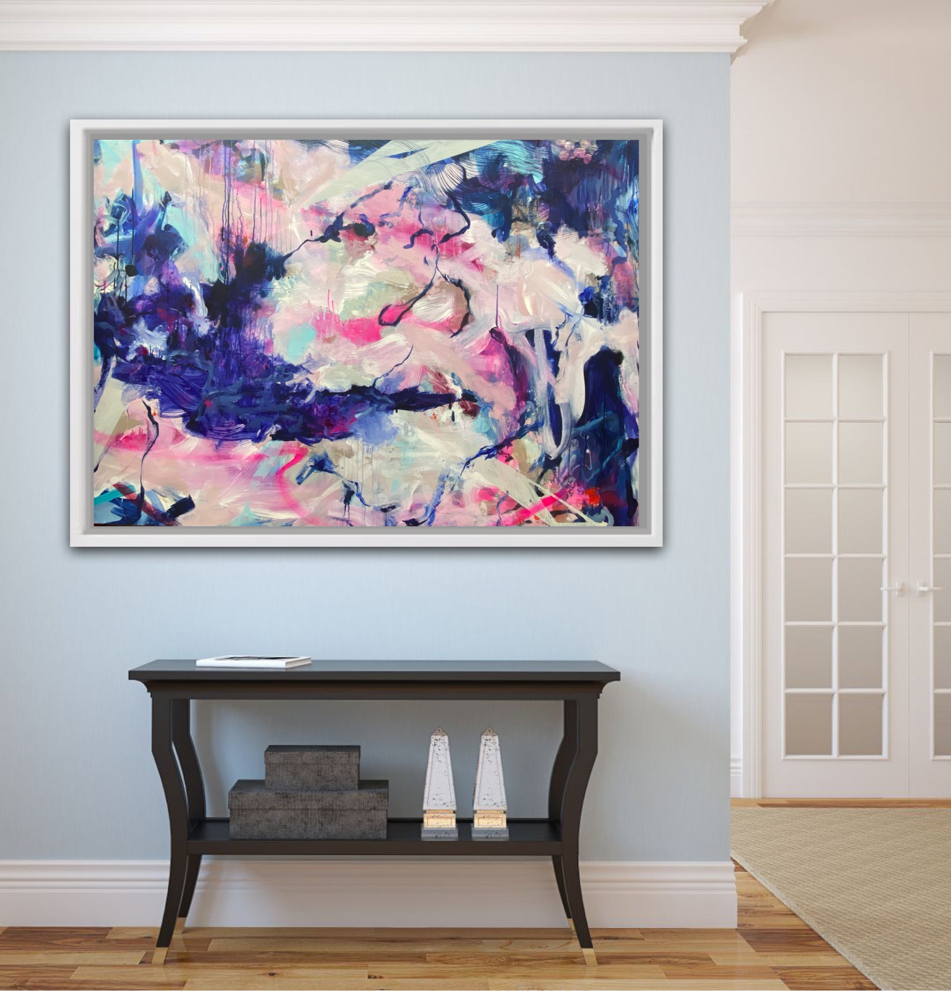 As you immerse yourself in this abstract waterscape, notice how your eye navigates the deep cavities of blue tones and lighter uplifting pink tones, revealing layers of calm and complexity within. This piece captures the essence of love's depth, and hinds to the enchanting beauty found within.
