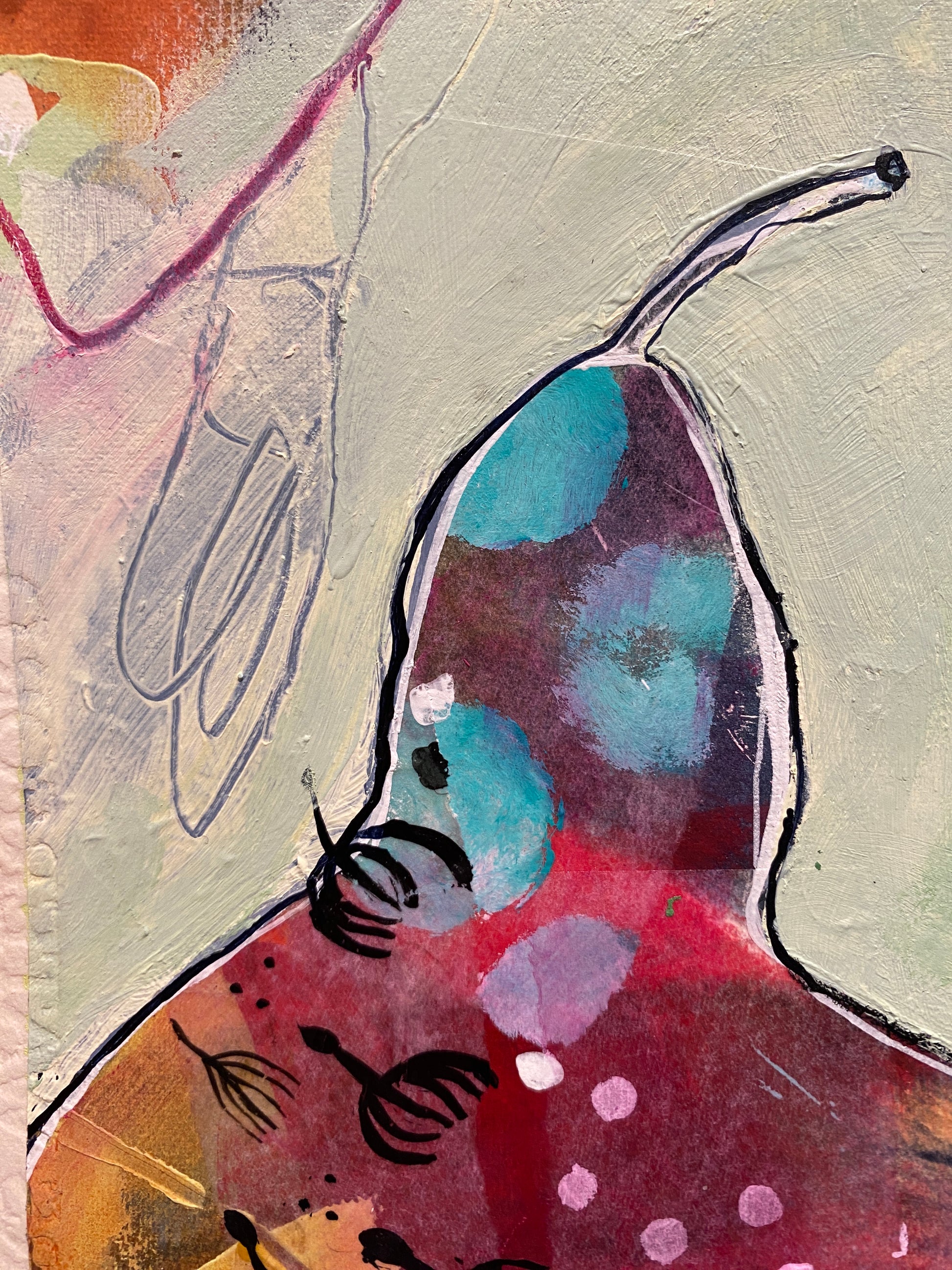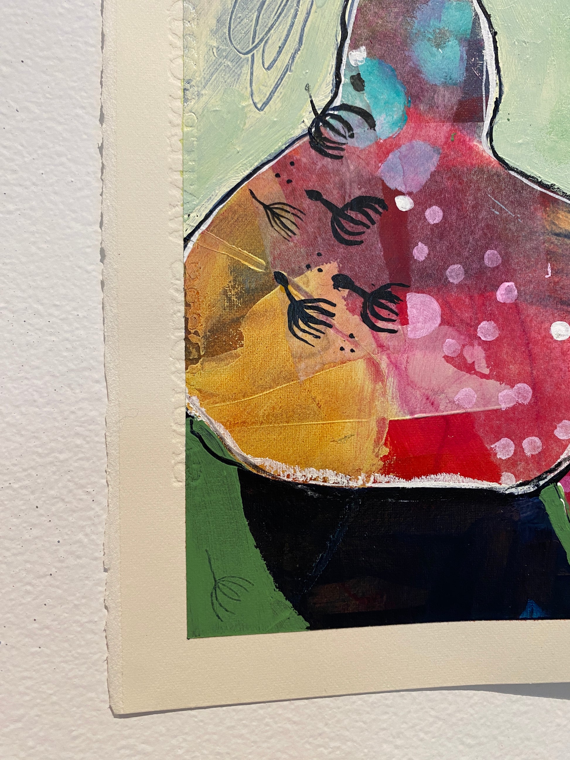 Hand made collage and mark-making suggestive of connection to nature by way of floating dandelion seeds and leaf veins.