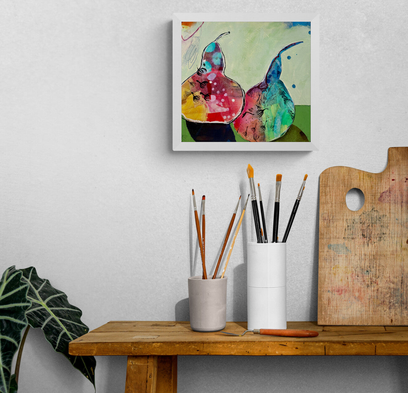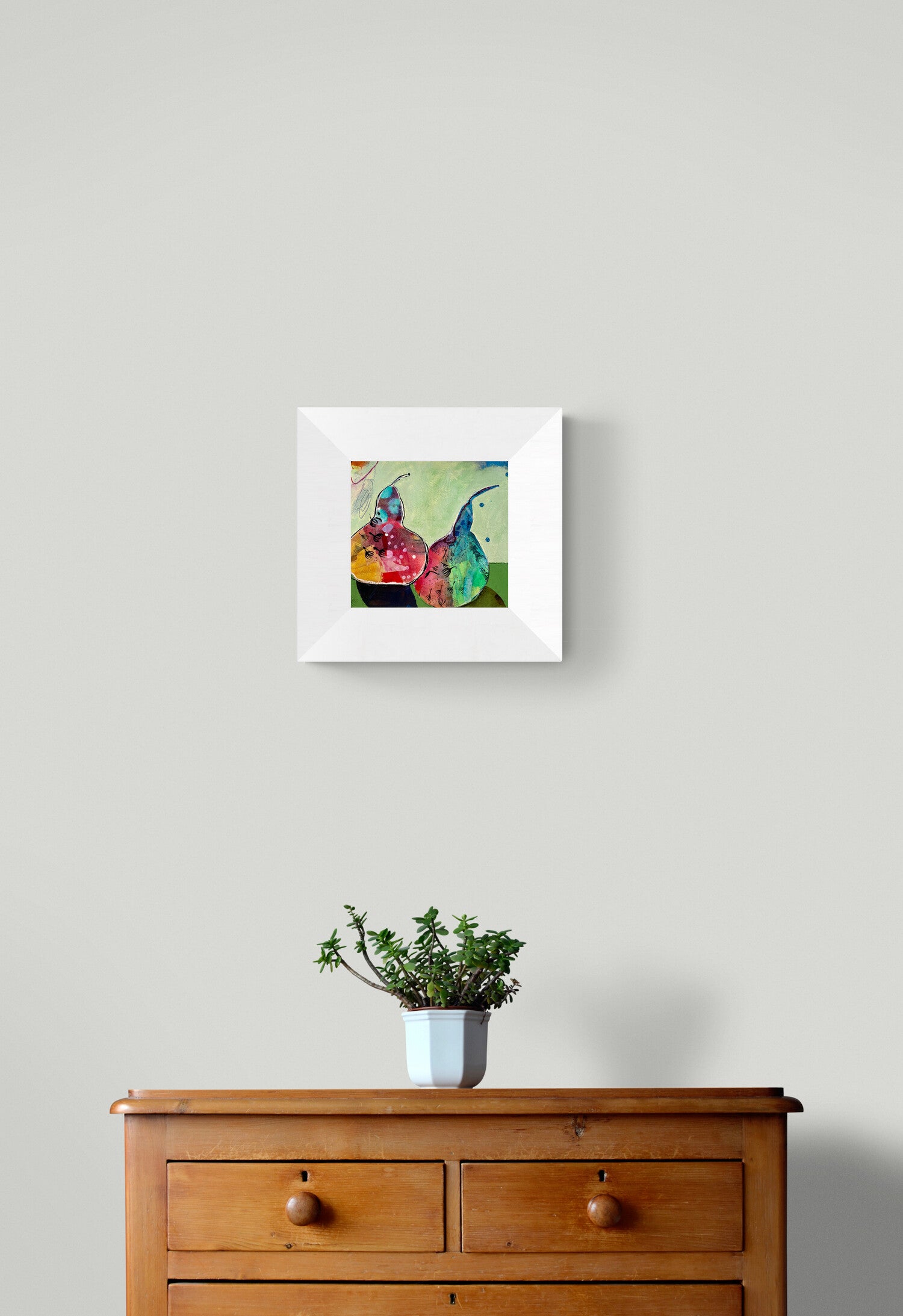 In this colourful abstract still life, a duo of rainbow pears radiate uplifting feelings of happiness and joy.