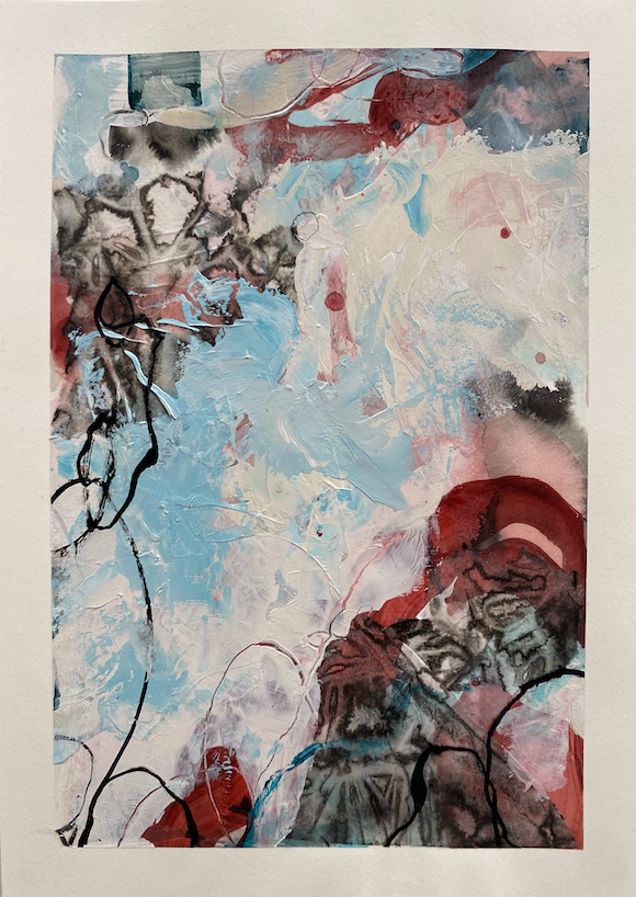 Inspiration for this abstracted landscape hints at the delicate equilibrium between strength and fragility depicted by the bold colour and delicate mark-making.