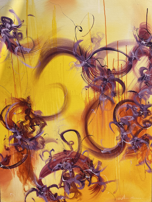 A combination of saturated vivid shades of yellow and rich gold create the spacious backdrop which contrasts against the patches of motion filled twirling purple lines.