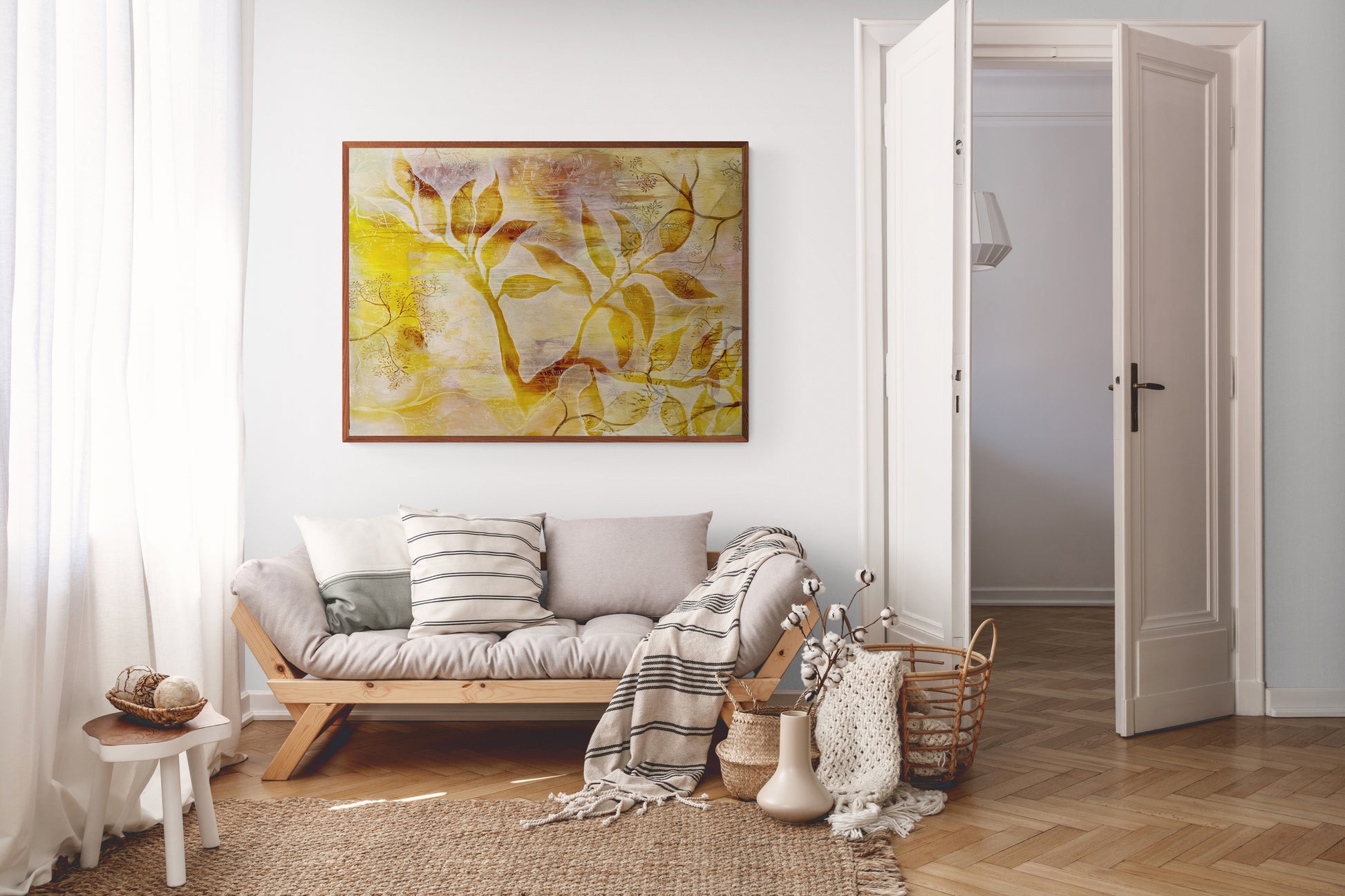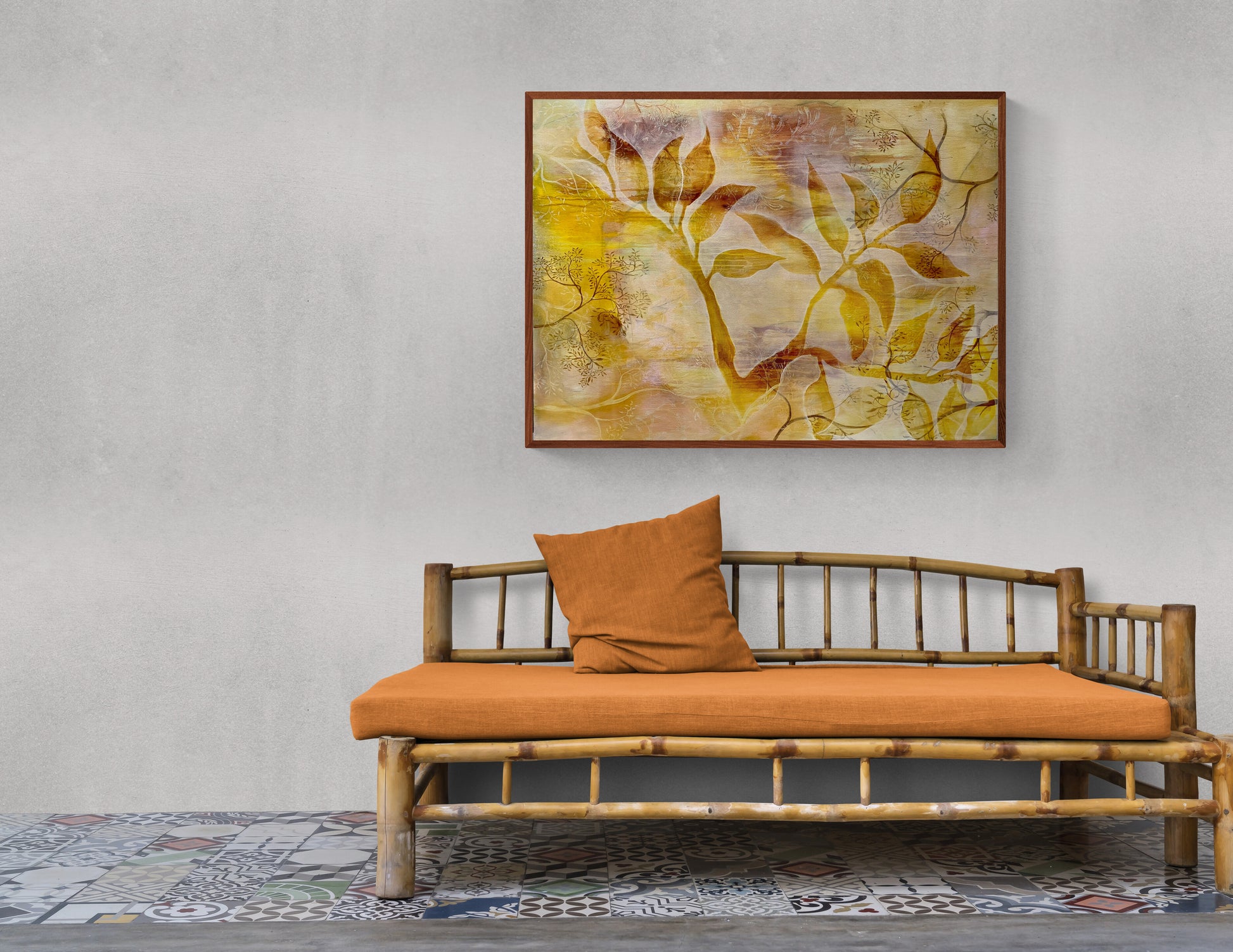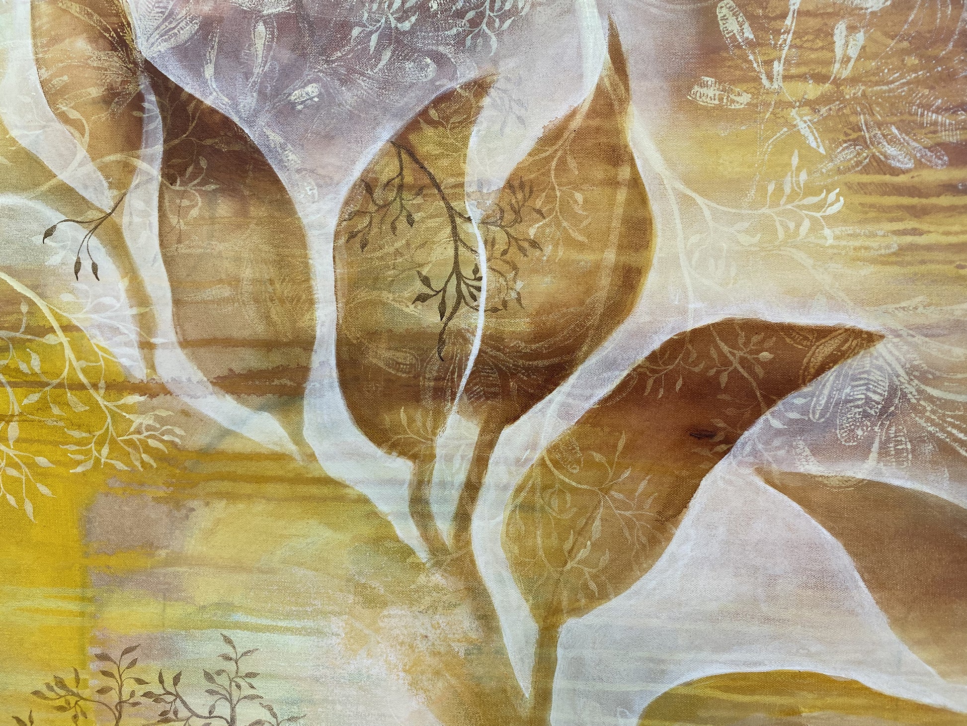 Pockets of detail fill the ethereal abstract landscape of Eucalyptus Sunshine. You know that feeling when the winter sun beams through your clothes as you sit quietly  near a window and your soul feels soothed? This is how the rich, golden earthy colours behave when gazing at this artwork.