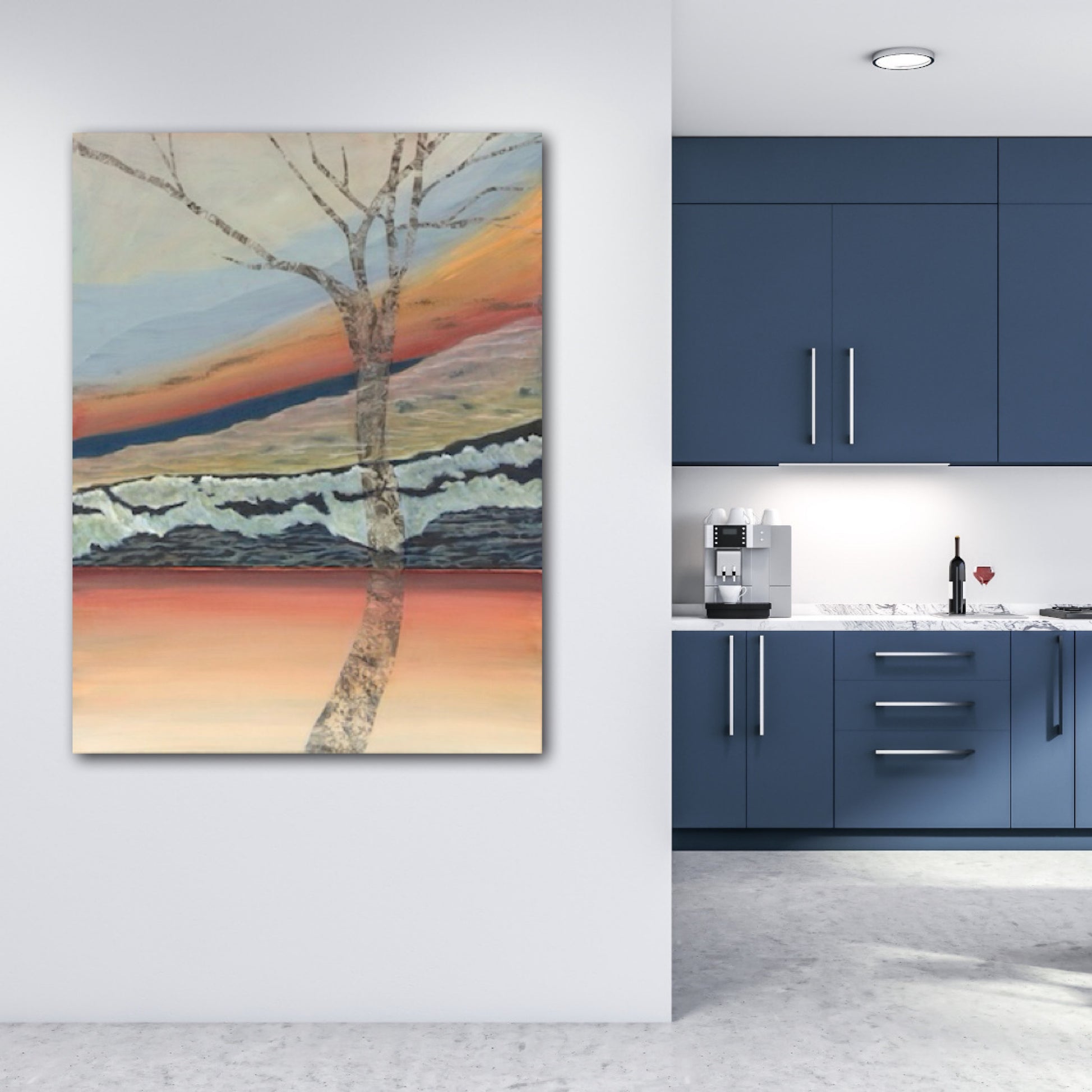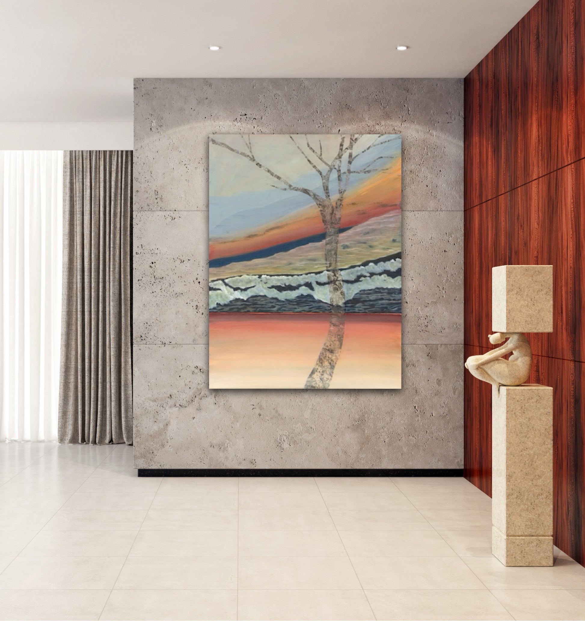 Colour and light impression into nature as a subtle act to entice mankind to seek deeper connection. This abstract artwork is all about connecting to nature through its various aspects. It plays with the idea of an ethereal and atmospheric rhelm where connection to colour, open shapes and light nourish the soul. Techniques used to soften hard edges create a more peaceful overall feeling for the viewer to impression their own interpretation.