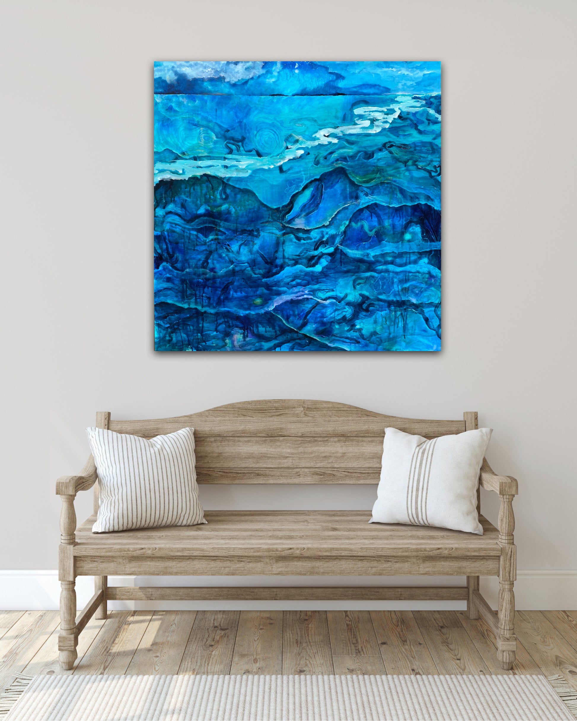 As an intuitive artist, I never know how a painting will turn out once completed which is part of the magic of creativity that I adore. From the start of this painting I held the intention of water in my awareness. As I journeyed with my brushes and paints, I found my connection to the energy of the ocean became stronger. It was as if I was inside the ocean seeing into all its deep crevices, feeling its movement, connecting to its essence and that of the ancient giants who call the ocean home. Painting this was like a moving meditation where I experienced a calm sense within and the feeling of being visited by these giants.