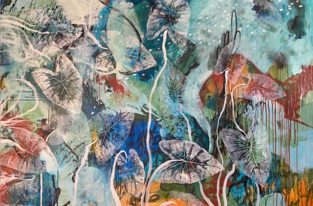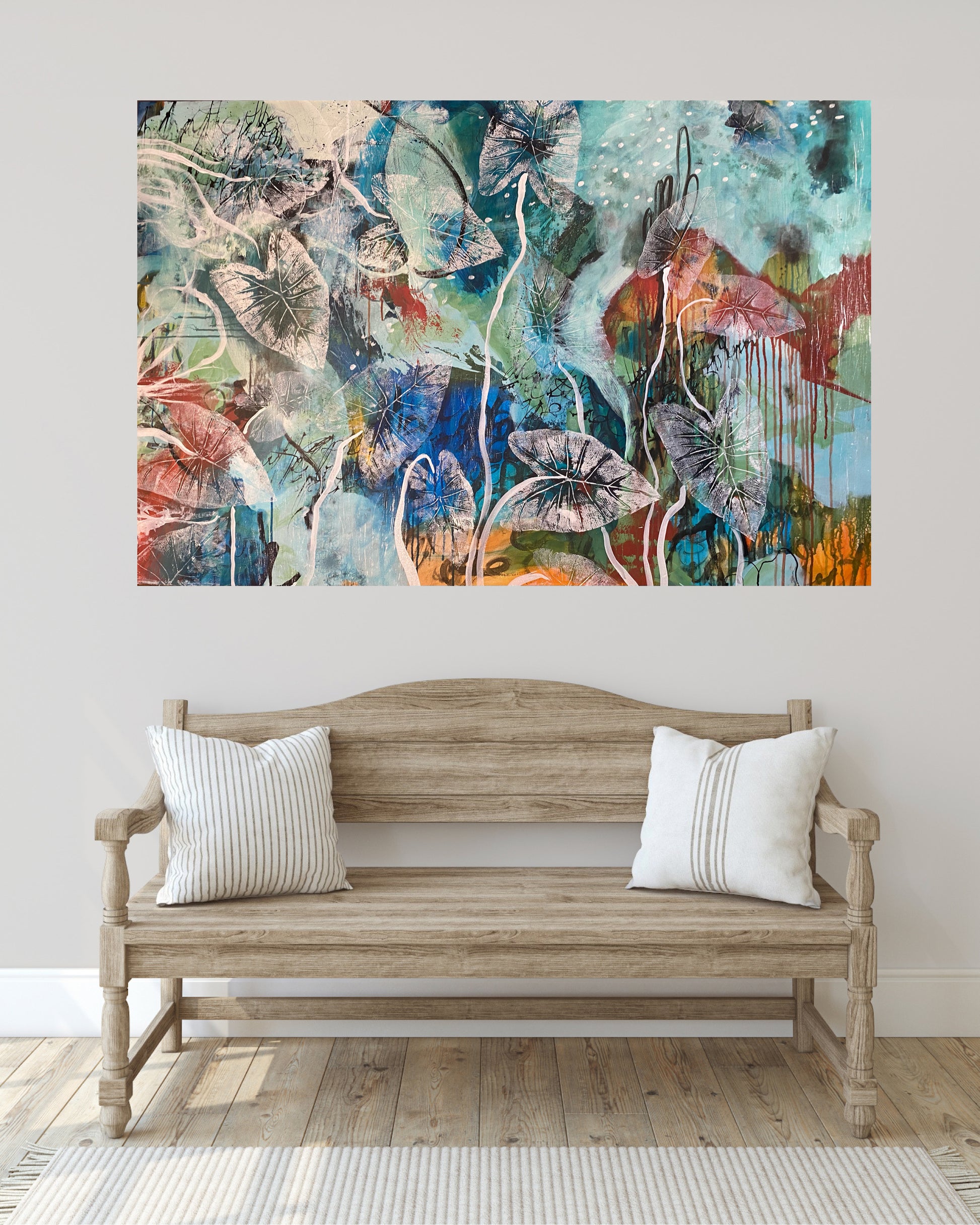 The leaves dance in the breeze in this abstract visual garden. Developed with limited colours this artwork offers uplifting and mesmerising views of a lush garden with koi swimming in the pond.