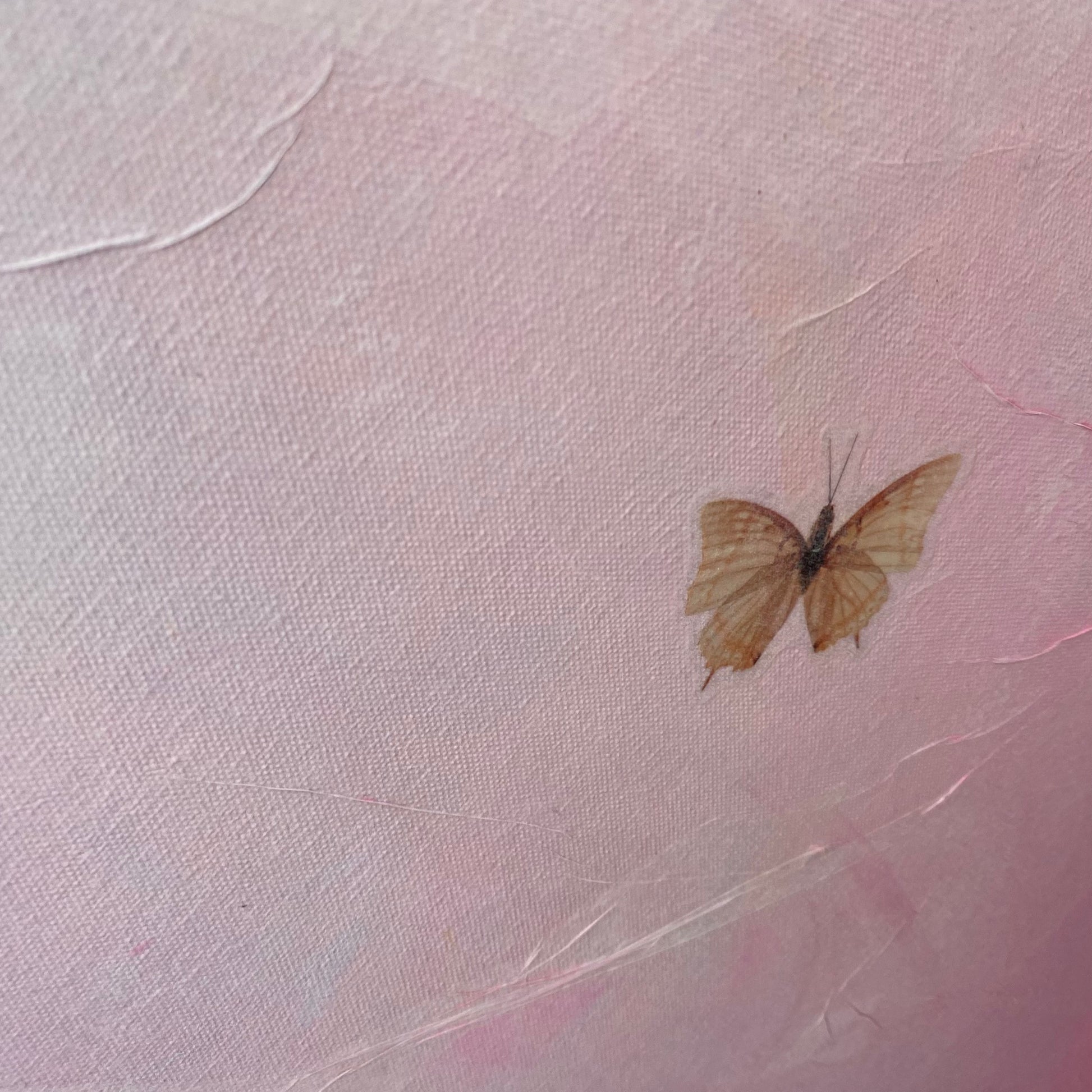 This canvas is a one off original artwork and comes with D-rings and wire ready to hang. The piece is stretched but UNFRAMED. Sides are painted with a wrap around finish to integrate the artwork. The work is created in acrylic paint and hand crafted tissue paper. All work has been sealed and varnished for protection.