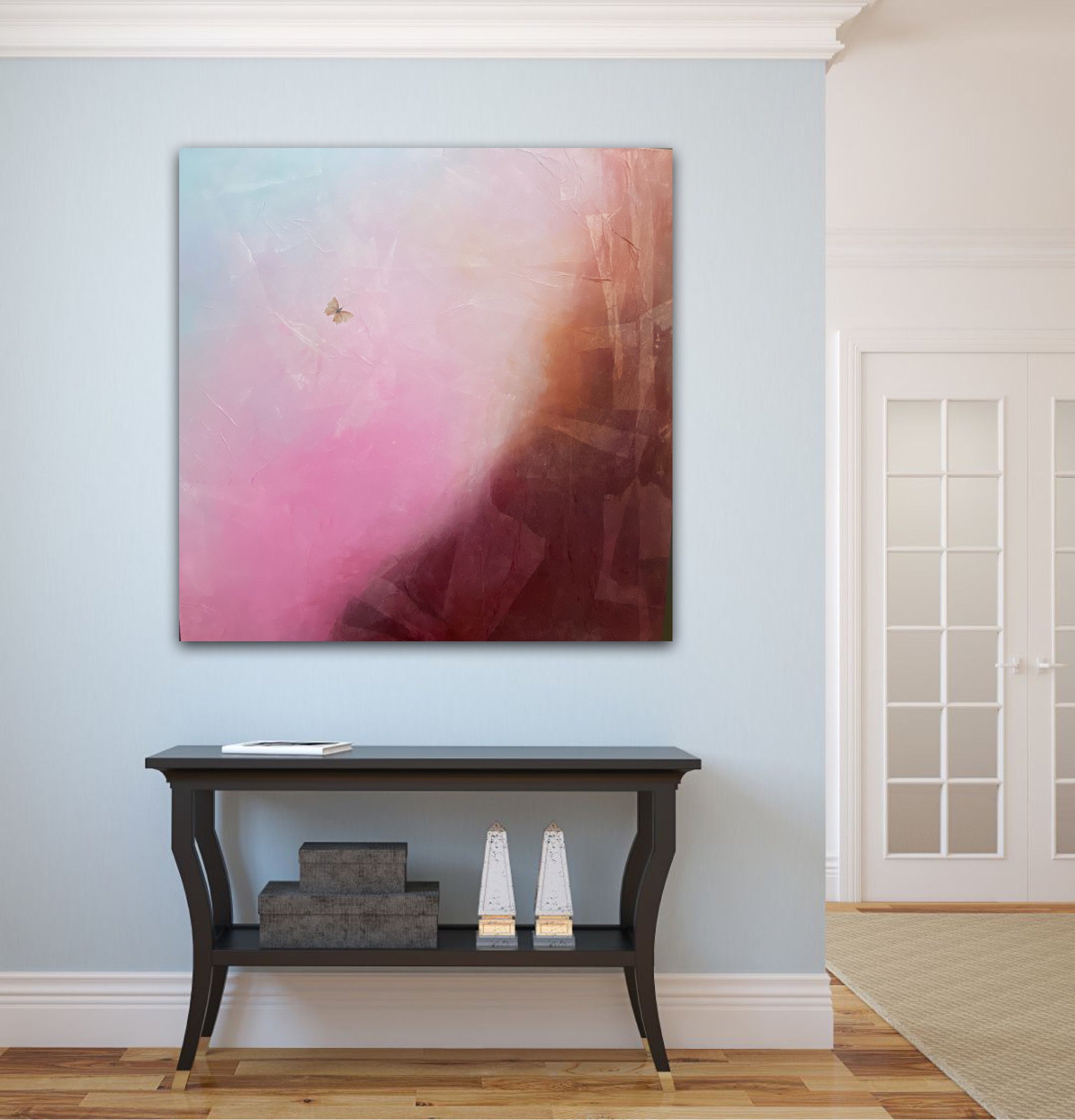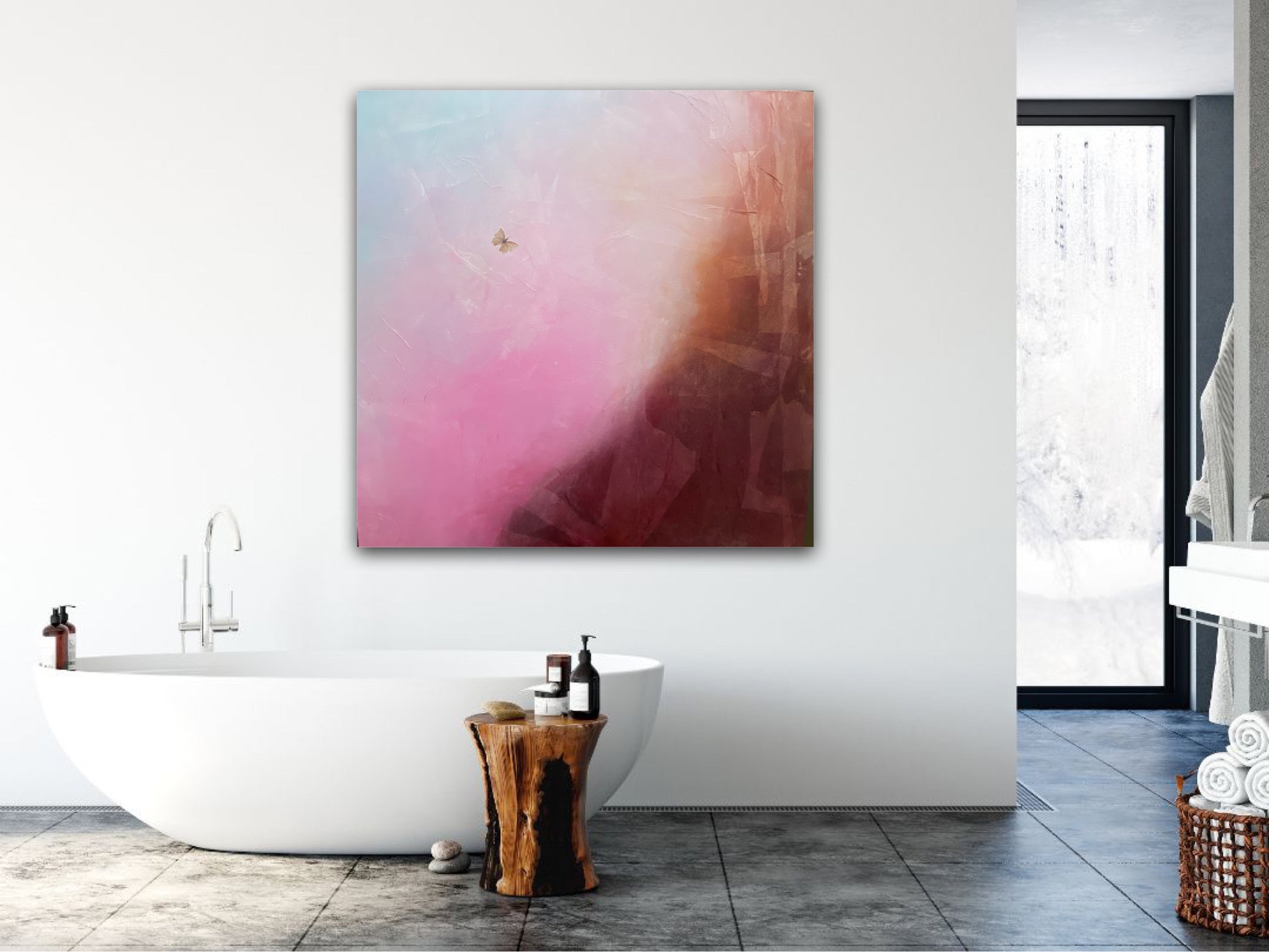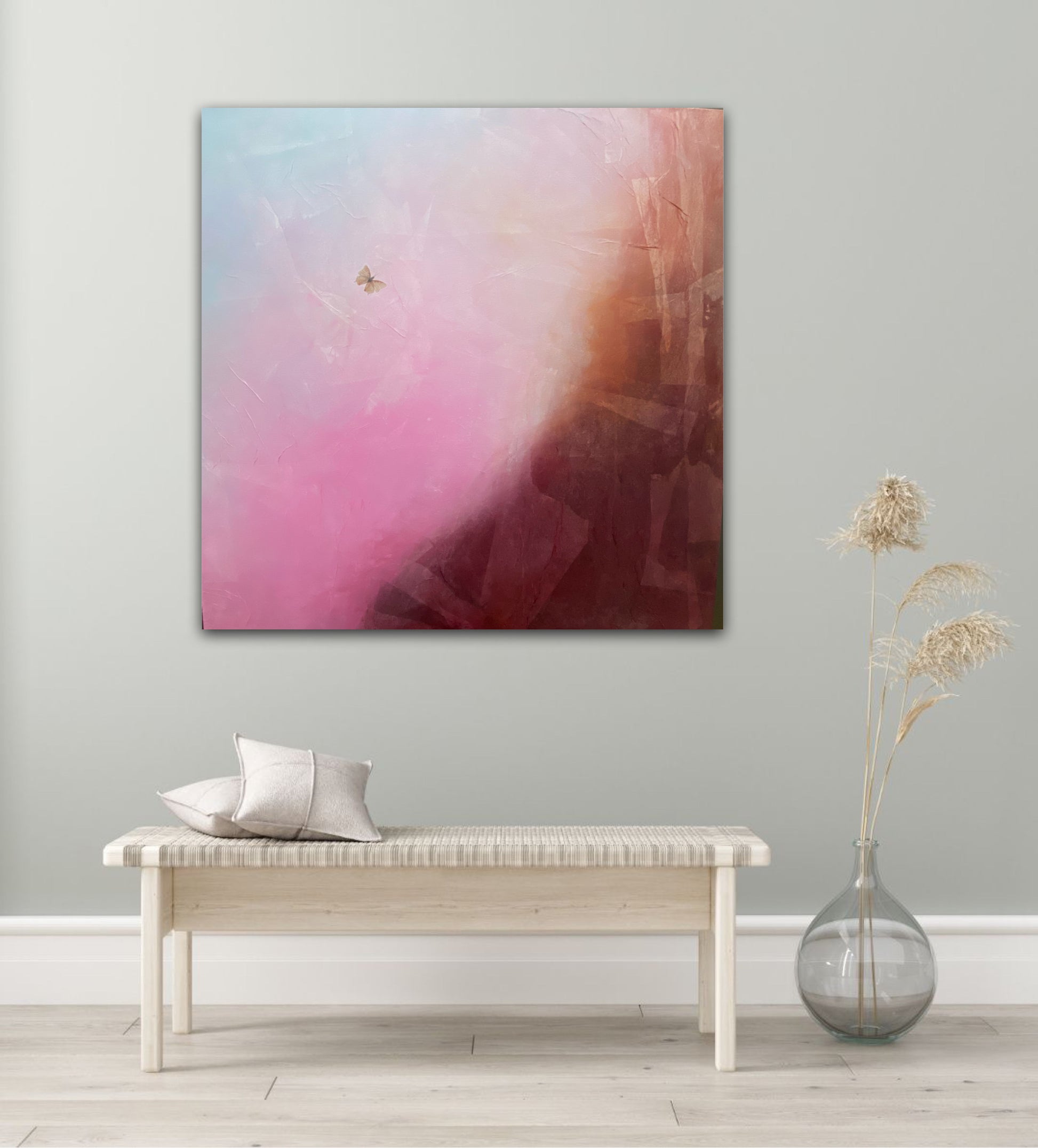 Janice draws your attention to the lone butterfly flying across a vast environment which captures attention in the magical colourful landscape. She suggest an uplifting peaceful yet calm presence within nature.