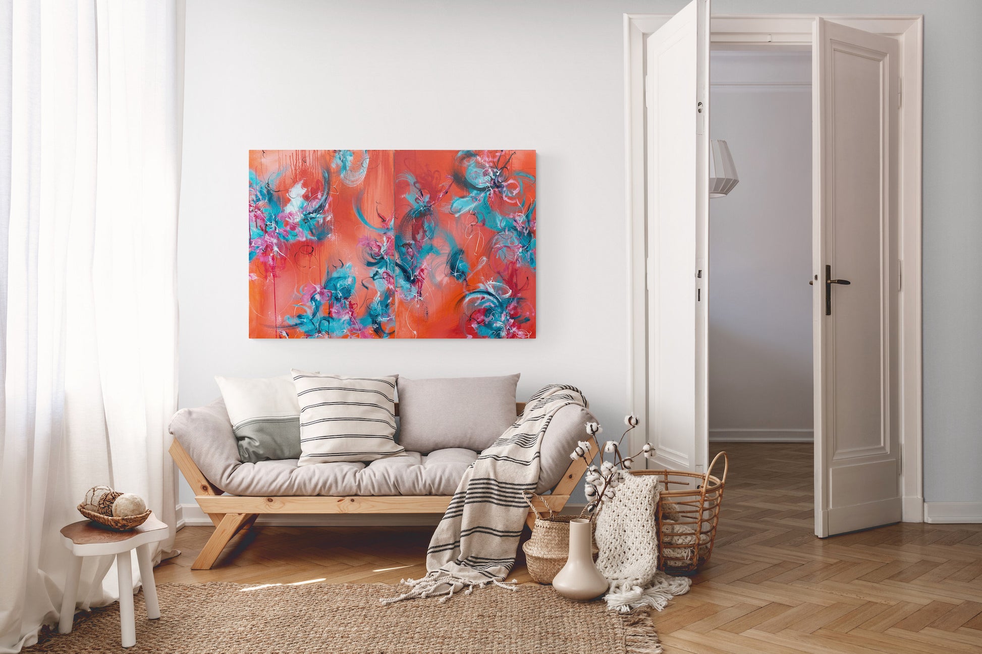 Passion Vines, a dyptich, is a dance of colour and the concept of contrasts.