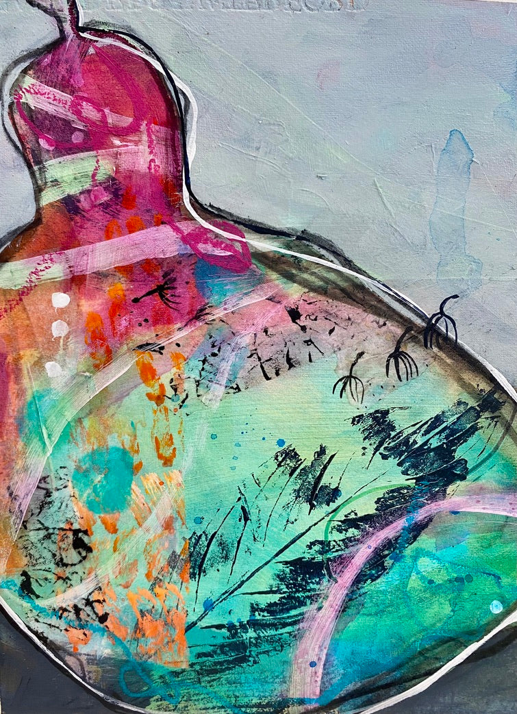 Curvaceous slim lines suggestive of aspects of the human form encase a playful display of mark-making which evokes connection to nature.