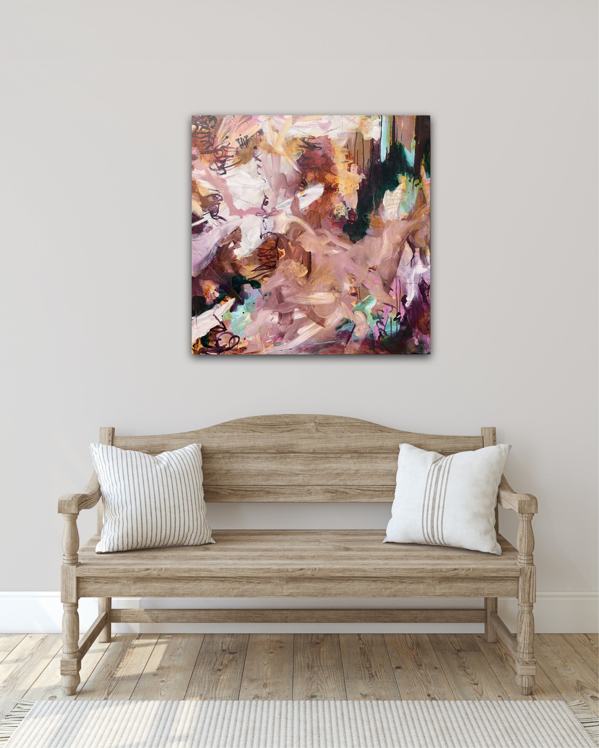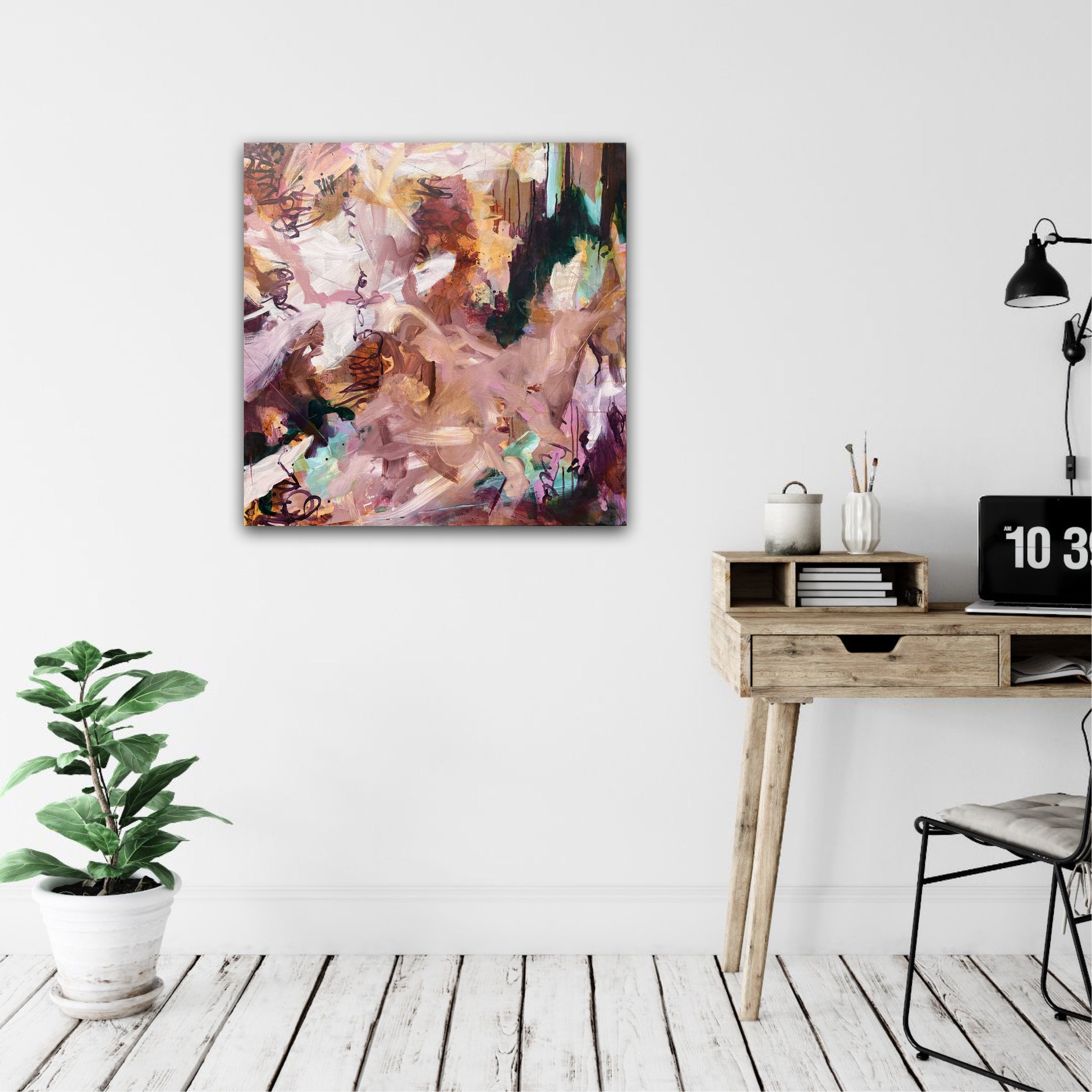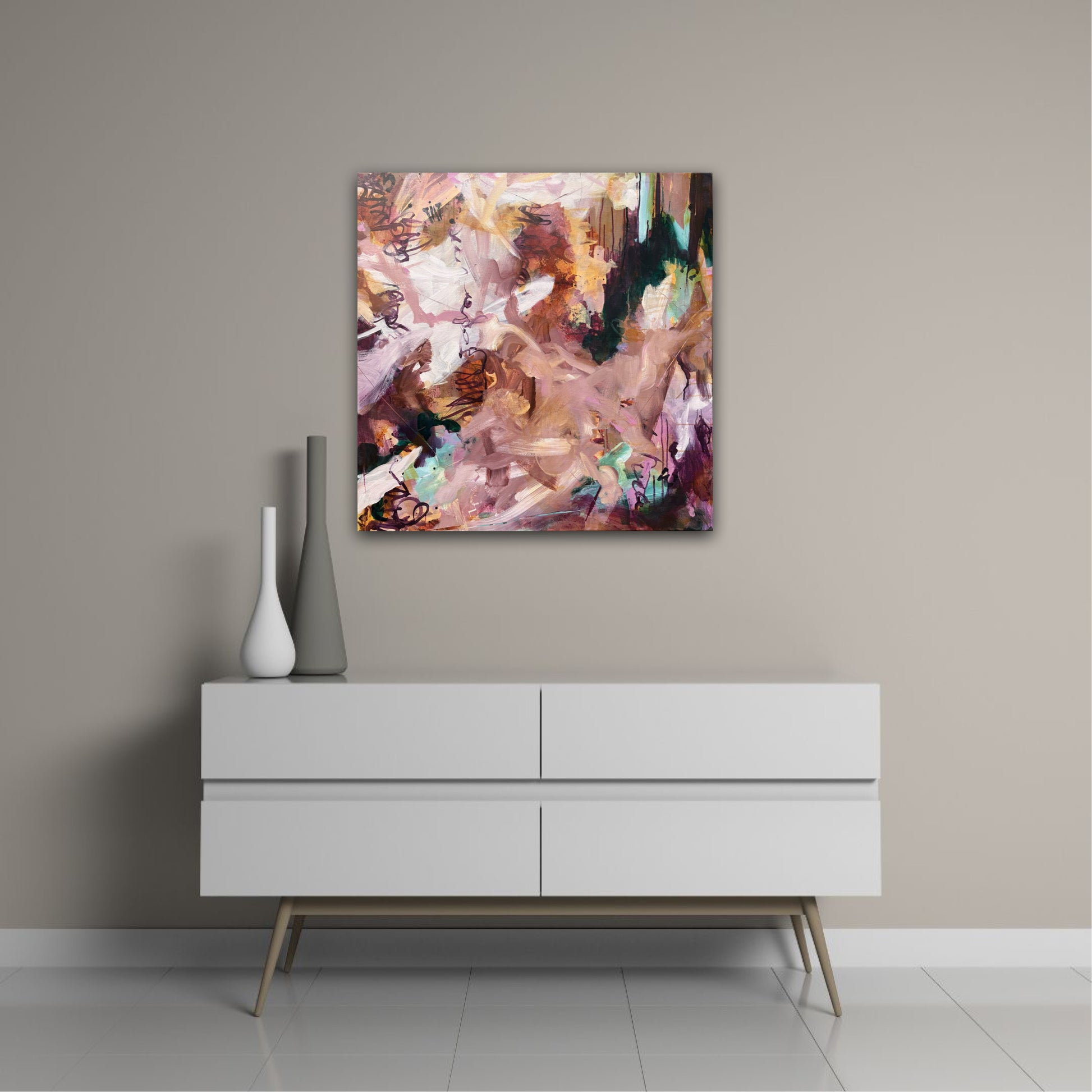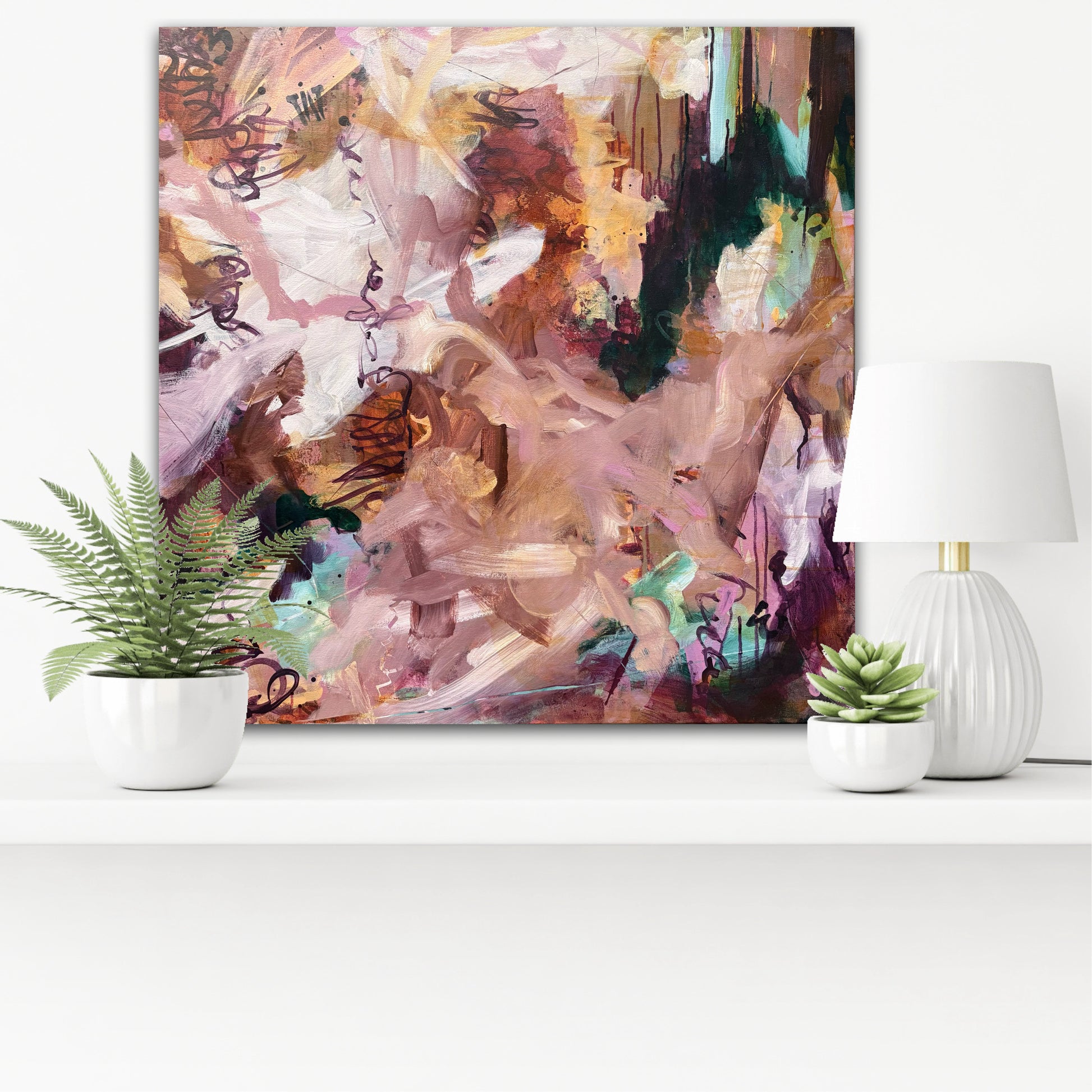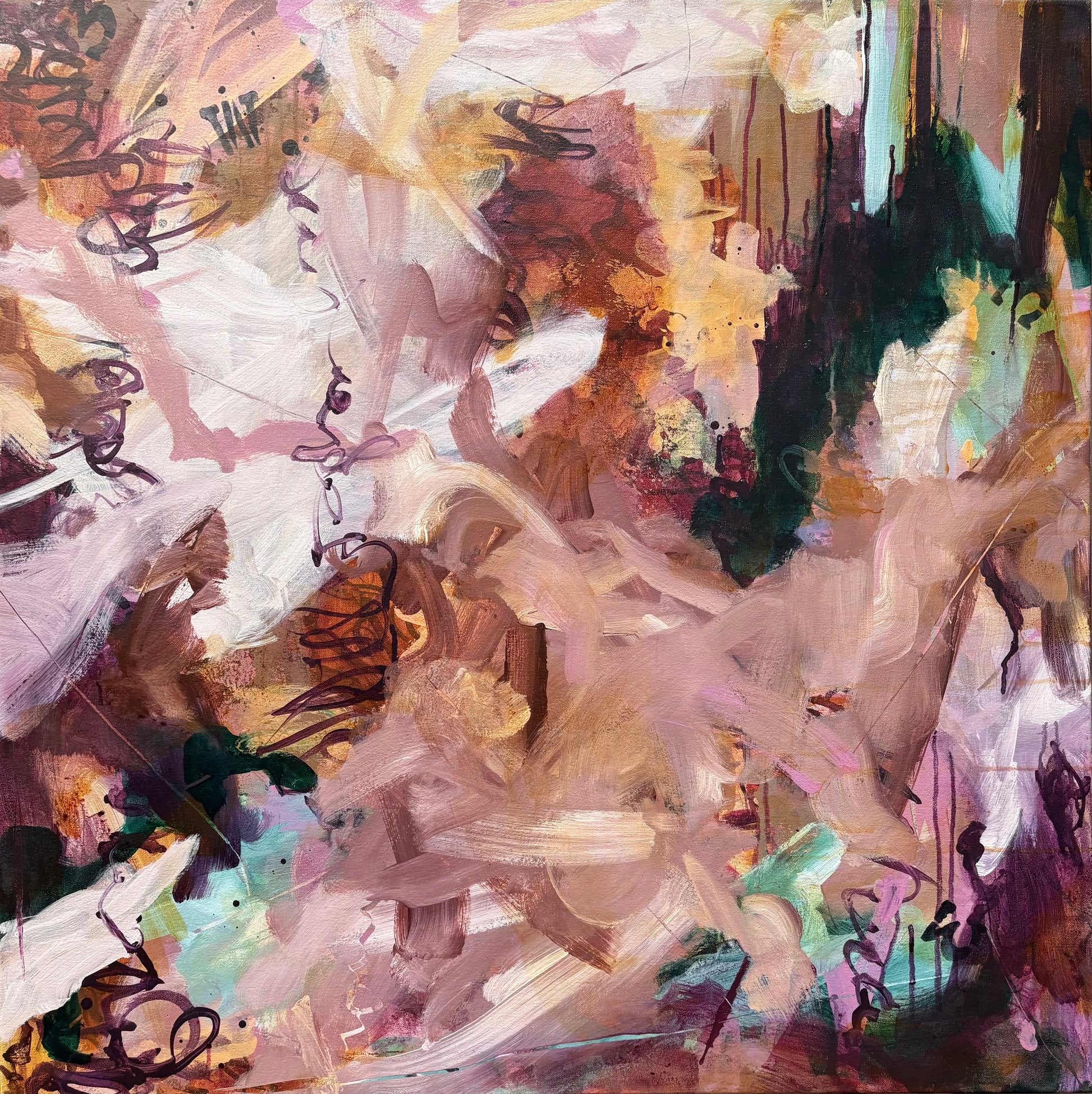 In Spiced Chai with Cake, Janice Eliovson explores the warmth of memory and comfort through abstract expression. The piece is grounded in a palette of rich, earthy tones—burnt sienna, soft blush, cinnamon, and deep plum—evoking the sensory experience of shared rituals, like a quiet moment with tea and cake. Pops of mint and amber act as visual accents, creating a dynamic sense of movement that guides the eye organically across the canvas.