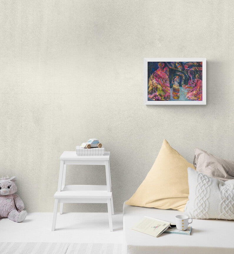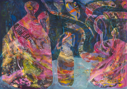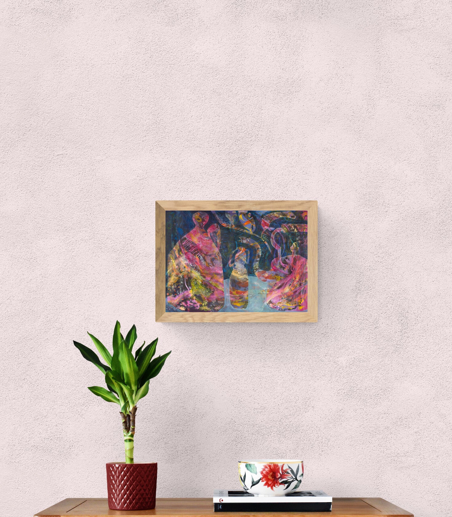 An intuitive painting on paper featuring a still life antique copper kettle and clay bottles.