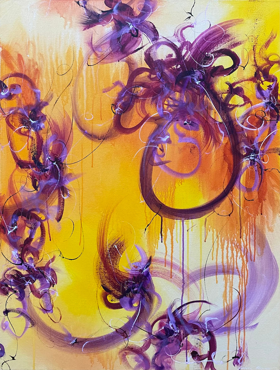 Saturated vibrant shades of warm yellow and rich gold hues create the spacious backdrop which contrasts against the movement of the tightly concentrated twirling purple lines.