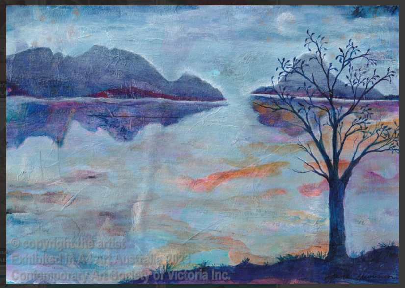 A lone Eucalyptus is fortunate enough to enjoy the view of this tranquil seascape, moonlight kisses the peaks of the solid mountains.  The mountains mirrored in the magical waters and hazed by the mist.