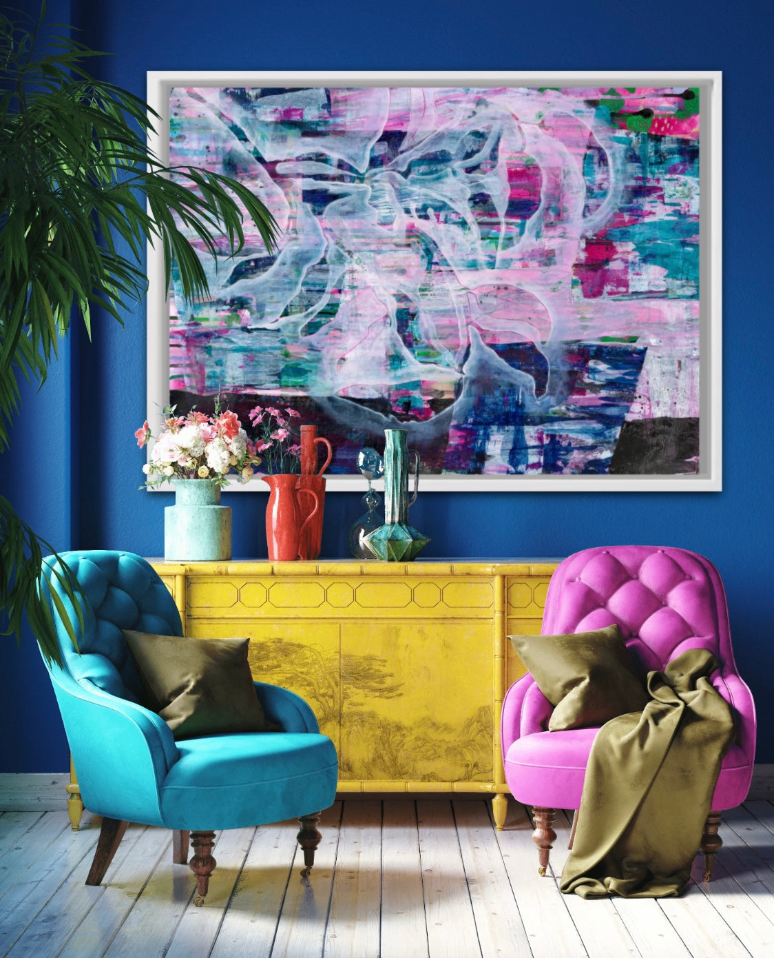 A candy floss pink and magenta wall play backdrop to the delicate mist of eucalypt branches.  This artwork can hang in landscape and portrait orientations.