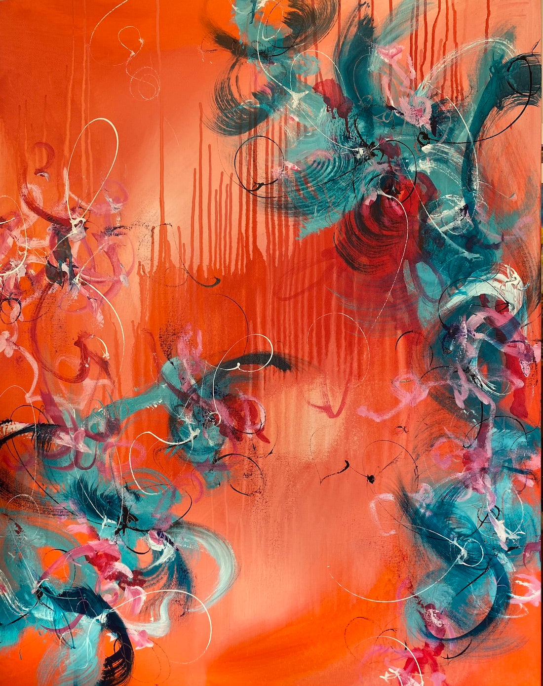 The contrast between the colours, the movement and stillness, the expansiveness and concentration of mark-making were the inspiration behind this artwork and the related artworks within this body of work.